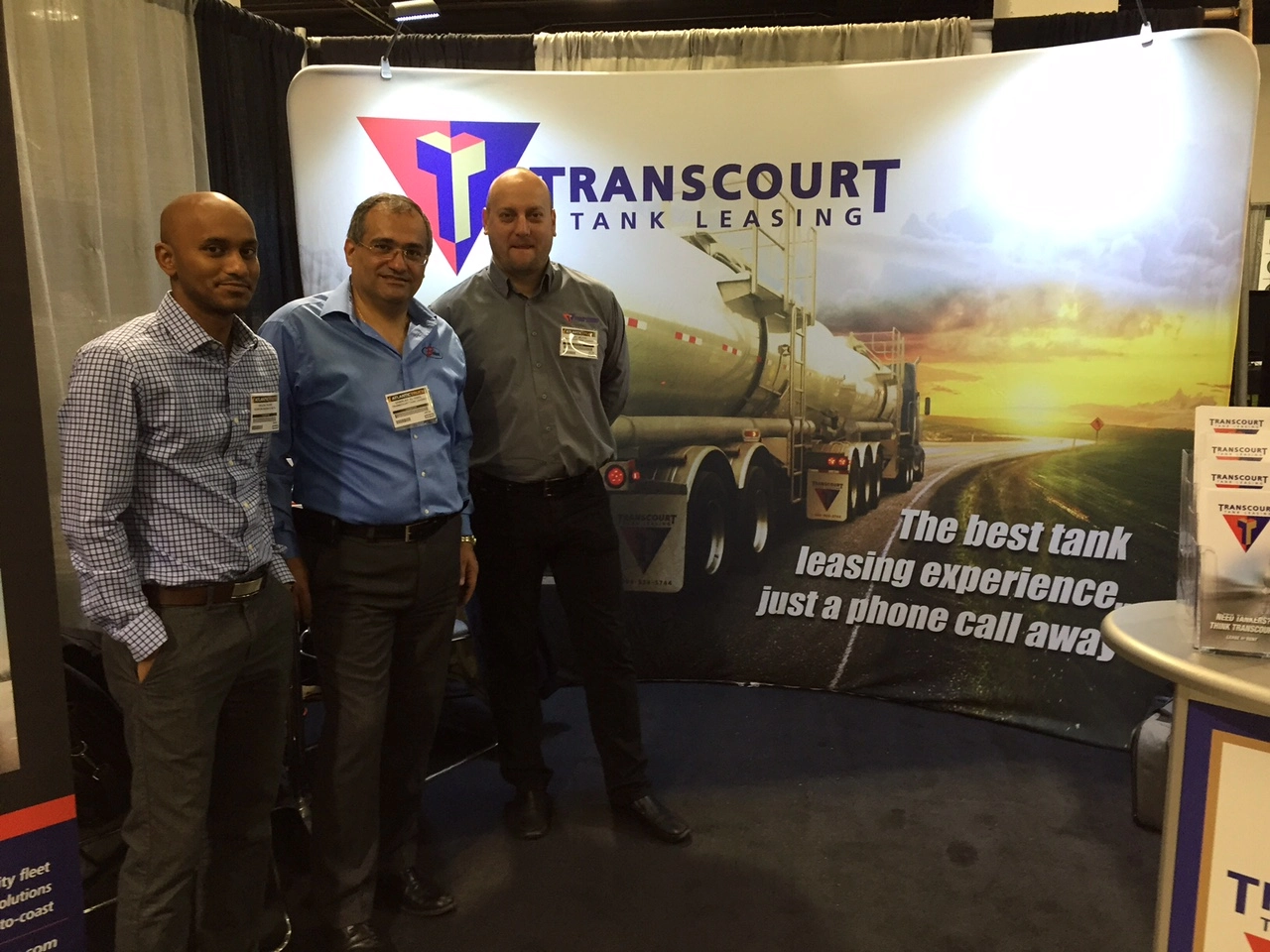 Tony Jelicic, Leasing Manager for Eastern Canada; Charles El Ogeil, from Bédard Tankers and Delon Rashid, from Truck and Trailer Magazine are seen here in the Transcourt booth in Moncton.