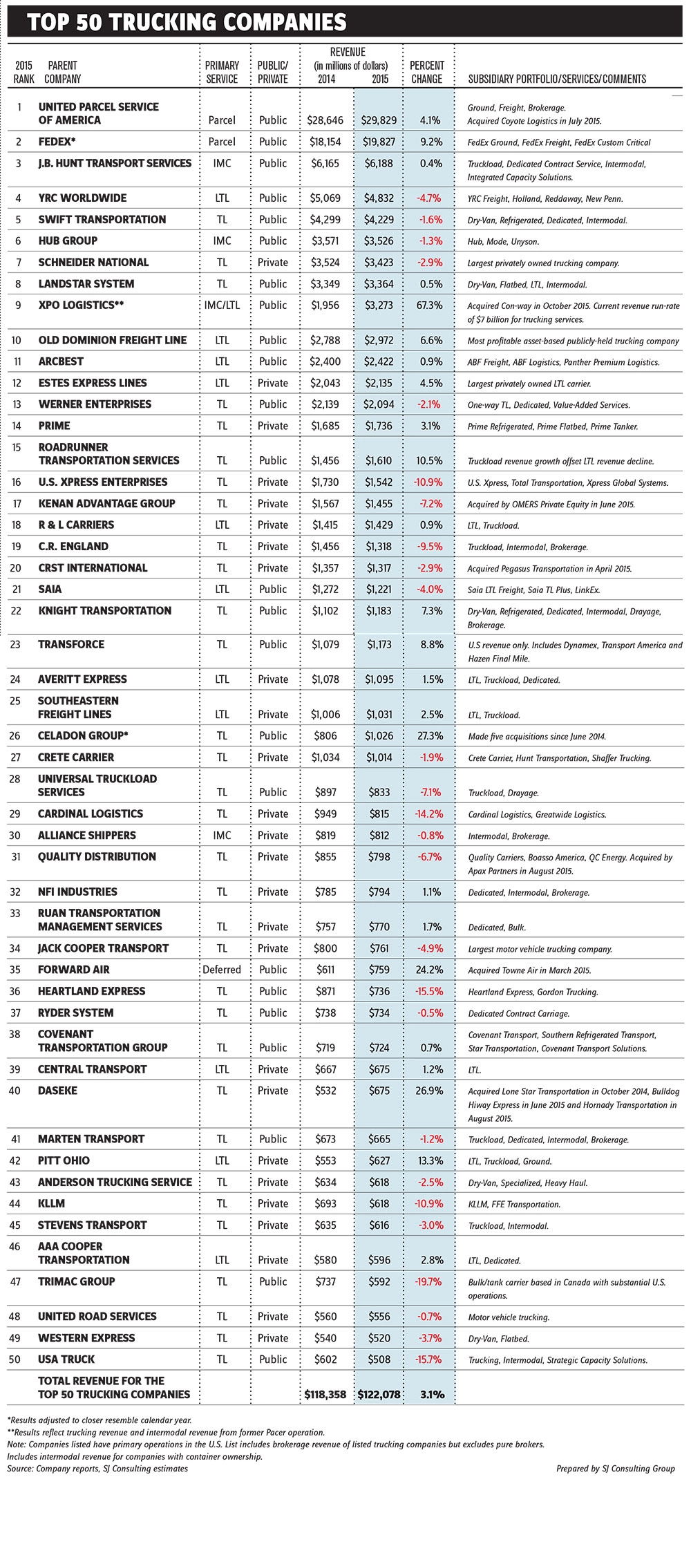 SJ Consulting Group has released its list of the top 50 trucking companies of 2015 by revenue and primary service. United States Parcel of America was ranked in 1st place with over $29 B in revenue for the year, with Fedex coming in a close second at $19B in revenue.