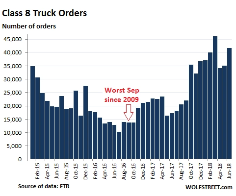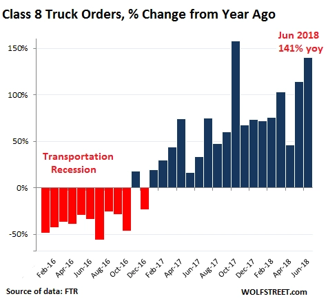 Orders for heavy trucks that haul trailers loaded with anything from junk food to oil-field equipment across the US skyrocketed 141% in June compared to a year ago, to 41,800 orders, making it the highest June ever recorded, according to transportation data provider FTR.